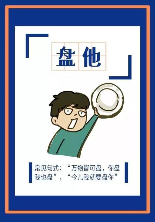 来源于相声《文玩》,在相声里有一句“干干巴巴的,麻麻赖赖的,一点都不圆润,盘他!”在网络流行词中,喜欢一个人可以用“盘他”,表示喜爱想把其捧在手心反复揉捏,讨厌一个人可以用“盘他”,表示类似“怼他”“揍他”的意思,不爽时也可以说“盘他”,反正甭管是啥,盘他!