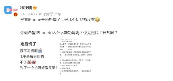 最近,有网友表示,自己买完iPhone就开始后悔了,因为好几个功能都没有。看来这位网友原来是安卓手机用户,改用苹果手机后习惯很好改变,但一些功能的缺失给其造成了很多不便。该网友开始怀疑,为了拍照好看买苹果手机真的值得吗?