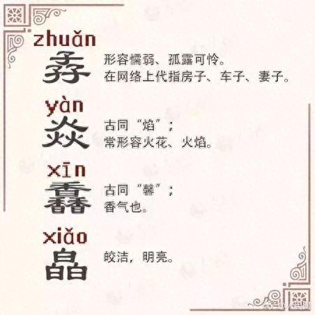 三火是焱(yàn),火花,火焰。其实,还有四个火摞一起而成的燚(yì),火燃烧的样子,多用于人名。“燚”应该是最火的汉字。
