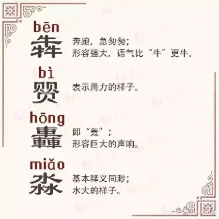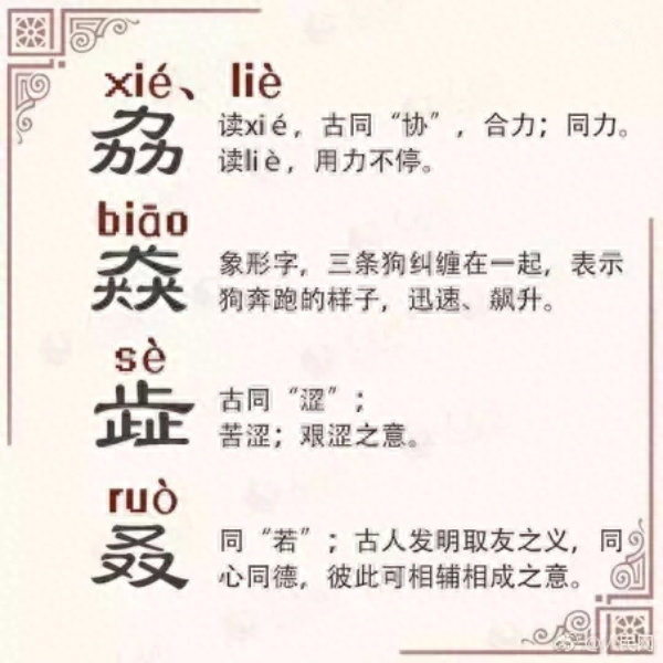 三犬是猋(biāo),本意是狗奔跑的样子,通“飙”,暴风,旋风。猋升(飙升)的意思是急速上升。