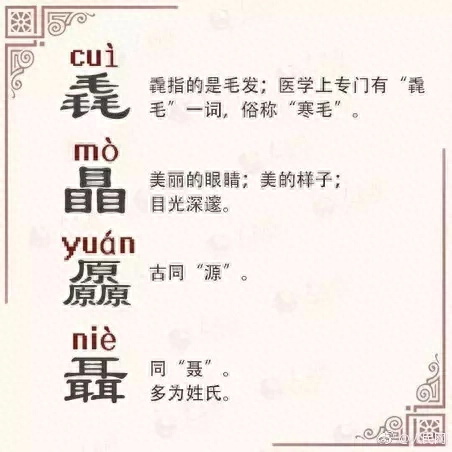 三毛是毳(cuì),会意,从三毛,本义是鸟兽的细毛。