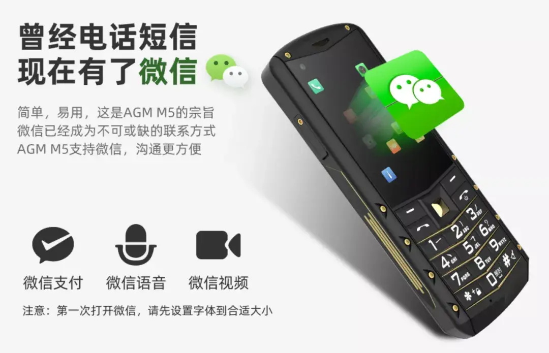 嘿嘿,这可难不倒机哥。机哥去扒他们家官网时,发现在之前他们就已经推出过一款支持微信的功能机:AGM M5。
