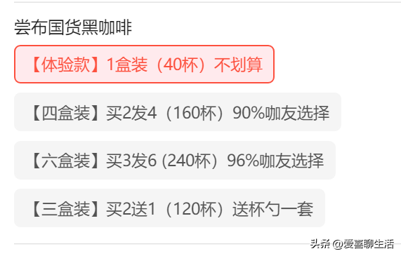 虽然它的味道不输任何咖啡,但是它的价格却很实惠,一盒里面有40个小包装,算起来一杯才几毛钱,不管是学生党还是上班族都能接受,建议喜欢喝咖啡的朋友,可以入手这一款咖啡,好喝不胖,性价比超高。对了,商家还有不定时的活动,买二发四,买三发六,买二送一套杯勺等活动,爱喝咖啡的朋友不要错过哦!