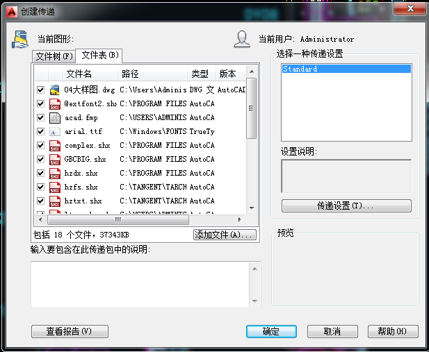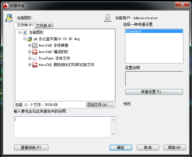3.并没有显示依赖的字体文件以及版本设置,那该如何将字体文件打包,并将所有DWG文件存为低版本呢?可以点击右边的『传递设置』按钮,然后点『修改』按钮。