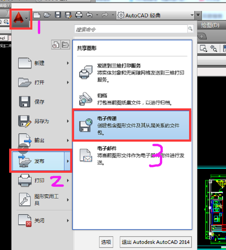 1.点击软件左上角的A图标,找到『发布』中的『电子传递』,或直接输入『ETRANSMIT』命令。