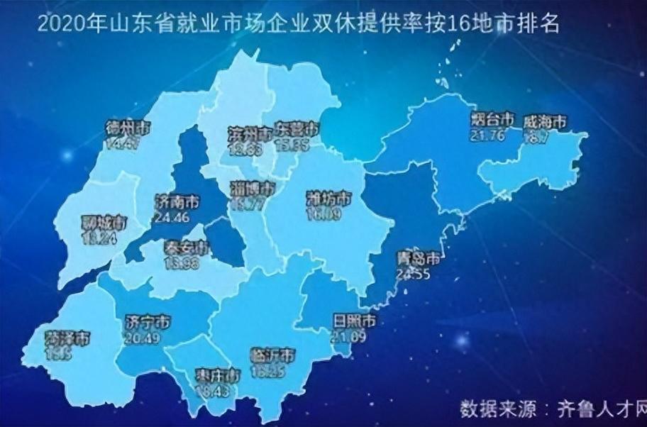 这是山东各地企业的双休提供率,其中青岛最高,双休提供率为24.55%