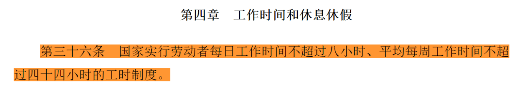 劳动法第三十六条规定:劳动者每天工作时间不超过8小时、平均每周工作时间不超过44小时