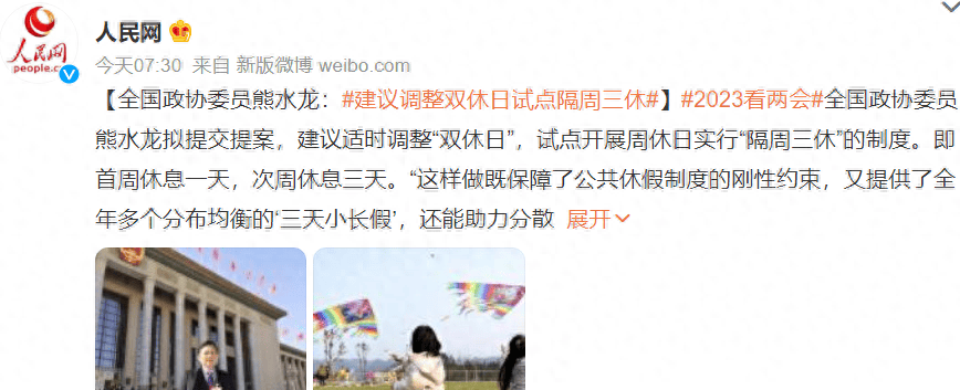 熊水龙提案建议,调整双休,呼吁搞“隔周三休