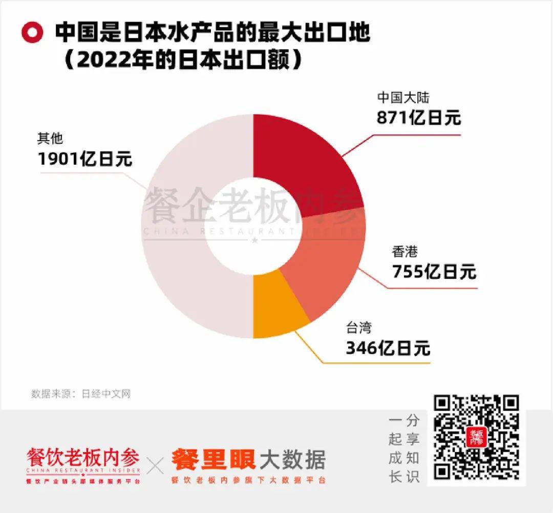 根据日本农林水产省的数据,中国是日本水产品的最大出口目的地,2022年,有871亿日元(约合43.4亿人民币)的日本水产品出口到中国大陆,占比22.5%。此外,还有755亿日元(约合37.6亿人民币)和346亿日元(约合17.2亿人民币)的日本水产品出口到香港和台湾。