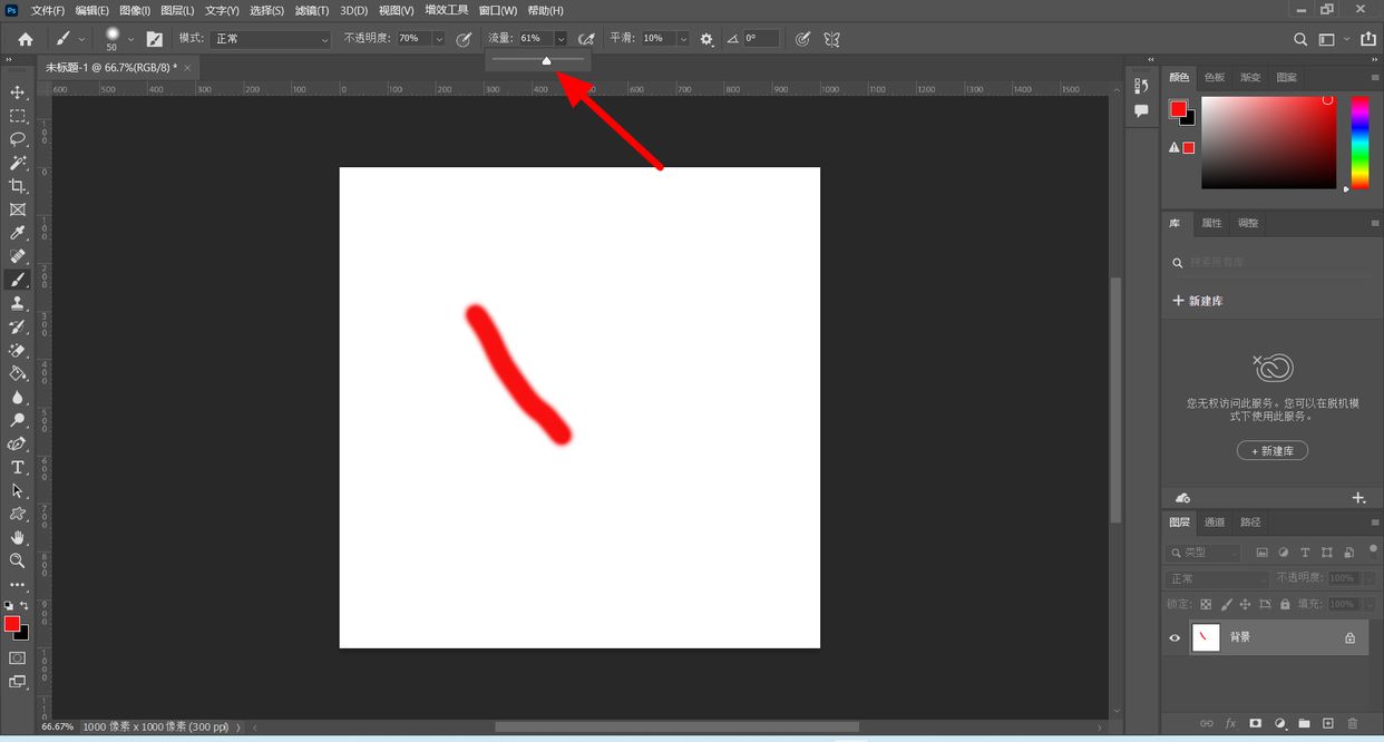 流量可以理解为画笔的轻重,流量越大代表使用的力度越大,在画布上的画笔痕迹越清晰。流量越小则表示力度越小,当流量为0时,画出的痕迹也无法被看到,调大流量即可解决。