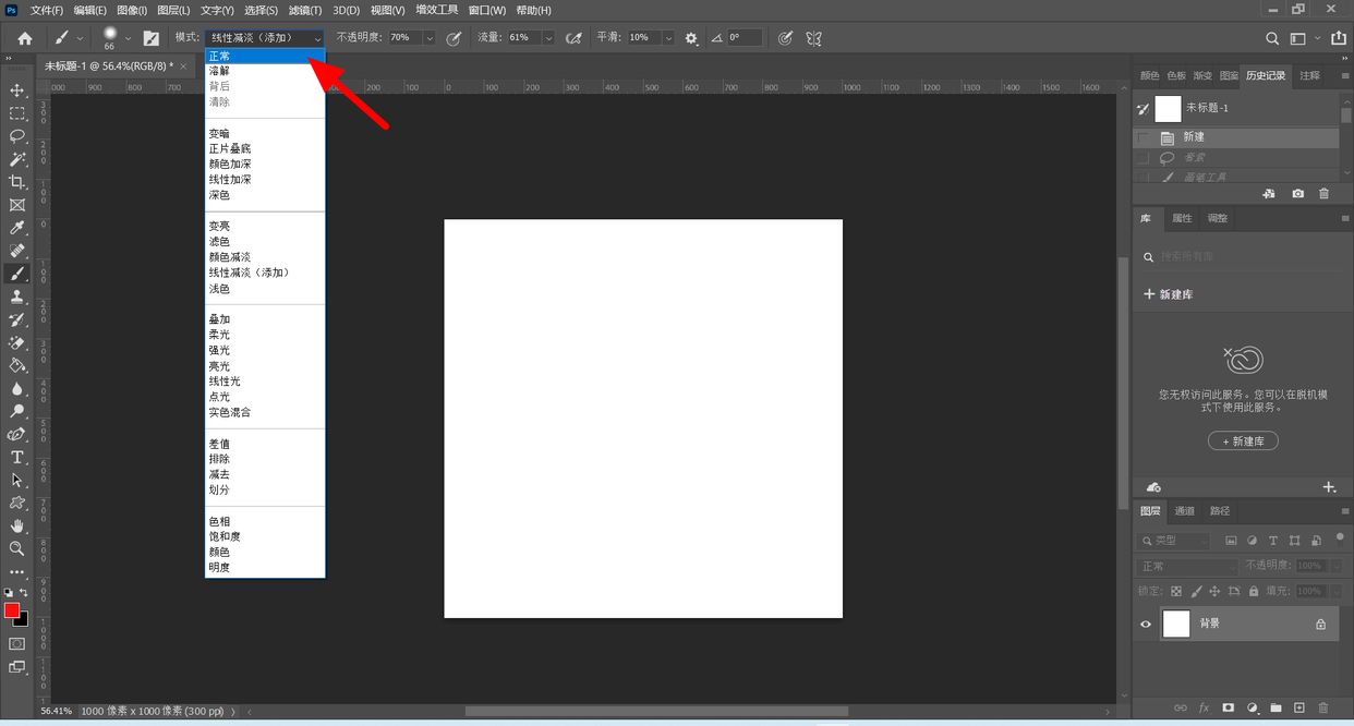 画笔混合模式中很多模式中使用画笔画出来很难看到颜色变化,需要切换成正常模式就可以解决。