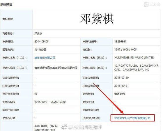 日前,也有网友翻出邓紫棋商标资讯,资料中显示,蜂鸟音乐有限公司在2014年9月5日申请了「邓紫棋」的商标,2015年7月20日通过初审,也在2015年10月21日进行注册公告,期限到2025年,而「GEM」的注册届满日,则是在2019年9月8日。此举让粉丝担心,若邓紫棋和公司解约,未来恐怕不能再继续使用「邓紫棋」这个名字。