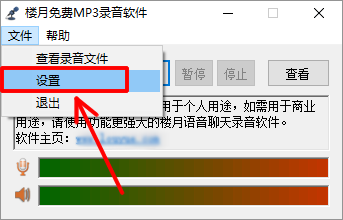 1, 首先在网上下载支持无损内录的录音软件,国内外都有这种免费的录音软件,如国外的Cok Free MP3 Recorder,国内的楼月免费MP3录音软件,安装并运行后,点击”文件”,”设置”菜单。