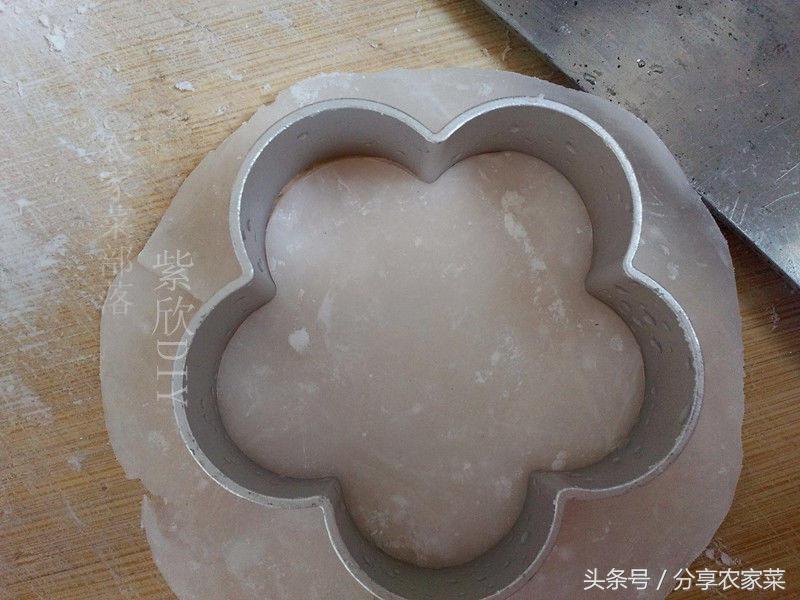 取一个小剂子用钝刀侧面均匀压成薄片 ,花型模具压出形状。
