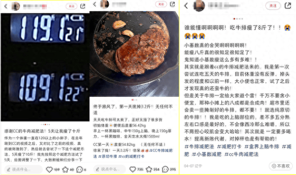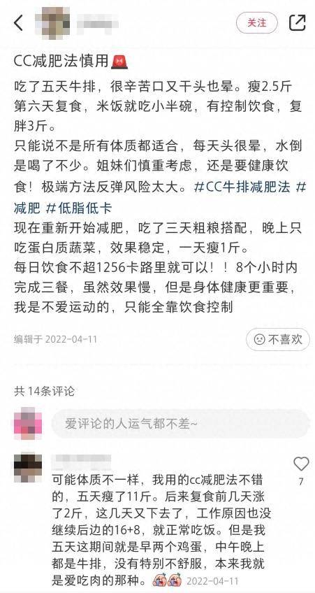 但也有不少网友反馈称,这种减肥方法要“慎用”。有网友写道,吃了五天牛排,瘦了2.5斤,但每天都觉得口干又头晕,“很辛苦”,复食后又胖了3斤。其写道,“不是所有体质都适合,极端方法反弹风险太大”。