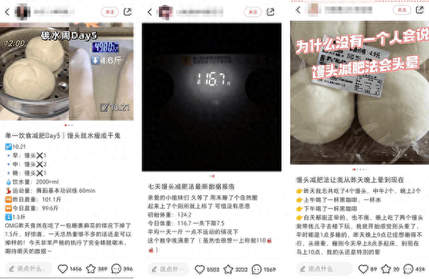 “昨天试了最近风很大的馒头减肥法,一天吃了4个馒头,一个馒头110克差不多,6点之前吃完的,下午还喝了一杯冰拿铁,瘦了2.9斤。”4月10号,有网友在小红书上这样写道。还有网友在单一食用馒头的基础上,根据自身情况调整食谱,加入了蛋白粉和蔬菜。