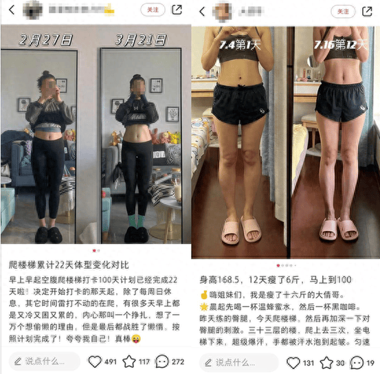 澎湃新闻注意到,近期,小红书、微博等社交平台上出现了不少快速减肥法,如空腹爬楼梯减肥法、牛排减肥法和馒头减肥法,有不少网友晒出日瘦3斤、月瘦20斤的体重变化对比照片,吸引不少蠢蠢欲试的网友加入其中。