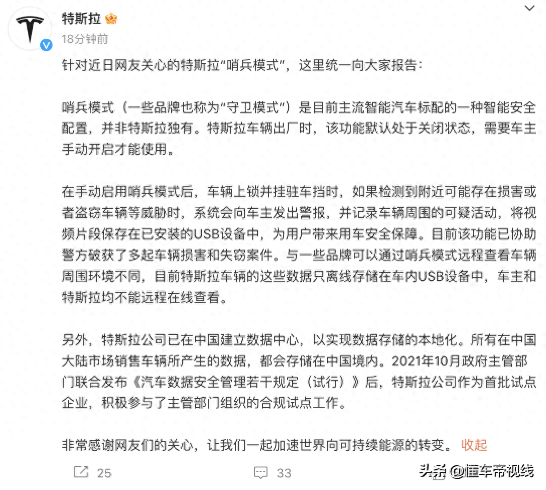 另外官方指出,特斯拉公司已在中国建立数据中心,以实现数据存储的本地化。