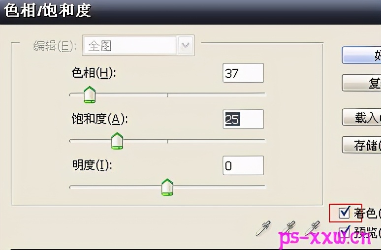 五、按快捷键CTRL+U打开色相/饱和度设置面板,选中面板下方的着色,然后设置它的色相和饱和度。