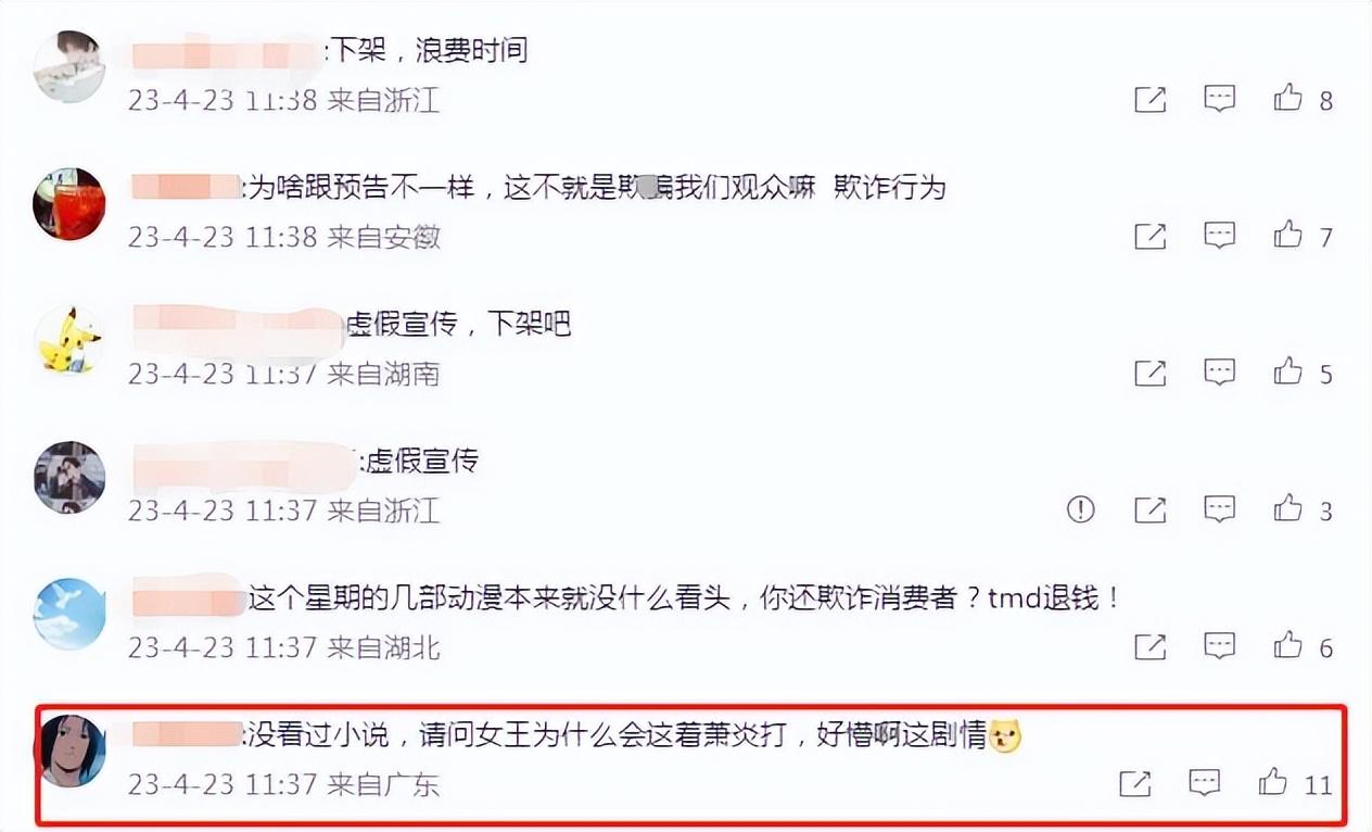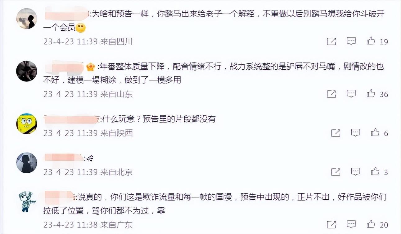 漫友们期待的剧情直接被一剪没,纵观国漫发展十余年,还没有一部动画在这些关键剧情上一剪没的,其实粉丝也没有要求官方放出一些露骨的画面,但也不至于连预告片的几个片段都删了,没看过原著的小伙伴根本不知道发生了什么事,这也难怪引起粉丝的不满,纷纷跑到官博下方留言谴责这种欺骗粉丝的行为