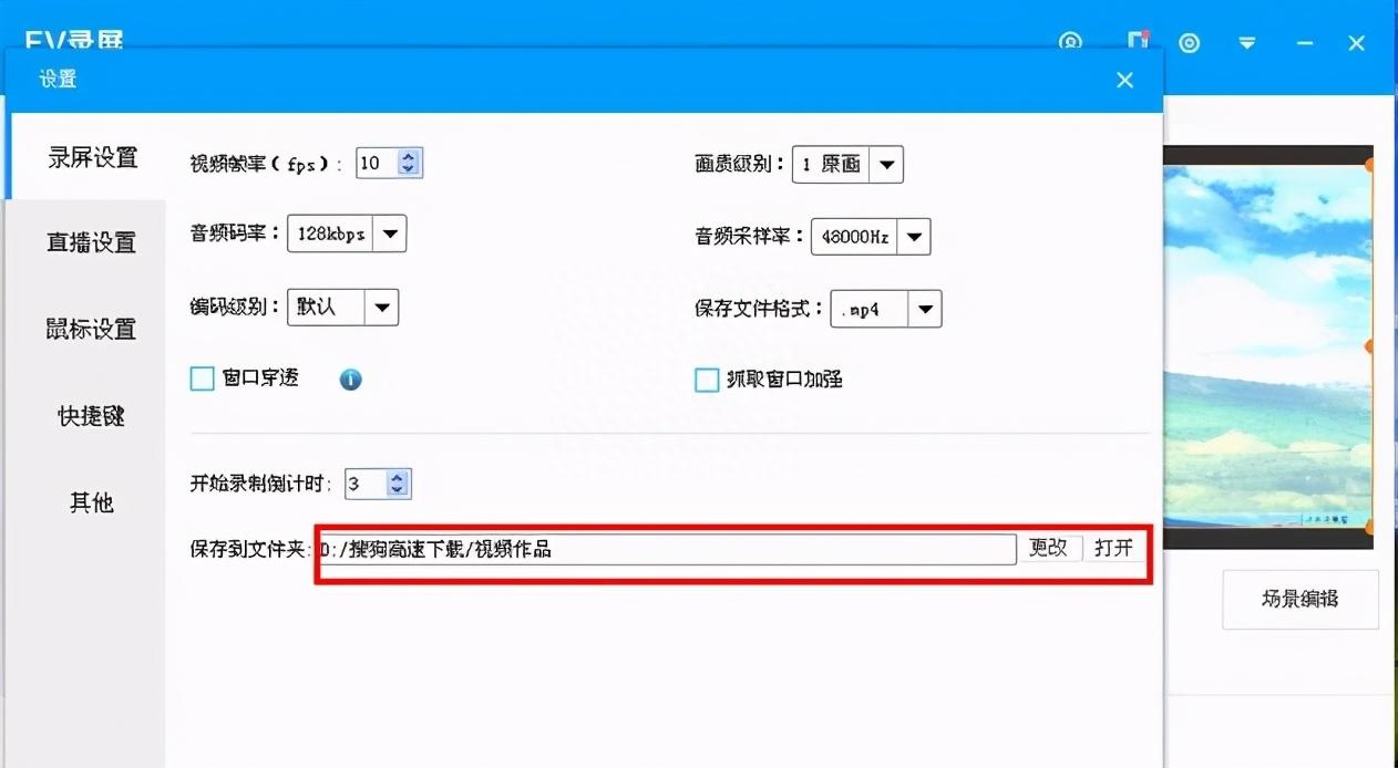 点击软件右上角的“设置”选项,选择切换至“录屏设置“选项,录屏设置里面的选择尽量不要去动,所有选项用默认的设置选项就可以,只需要大家设置”保存到文件夹“就可以,该选项是录制完视频的输出路径。