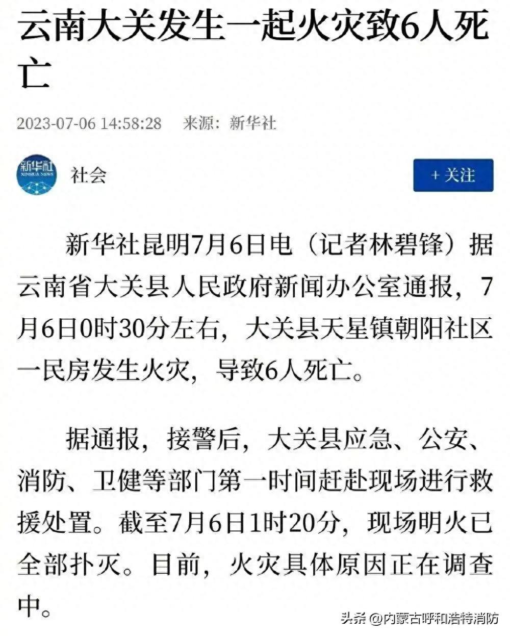 7月6日0时30分左右,云南省昭通市大关县天星镇朝阳社区一民房发生火灾,截至7月6日1时20分,现场明火已全部扑灭,经现场核查,事故造成6人死亡,目前,火灾具体原因正在调查中。