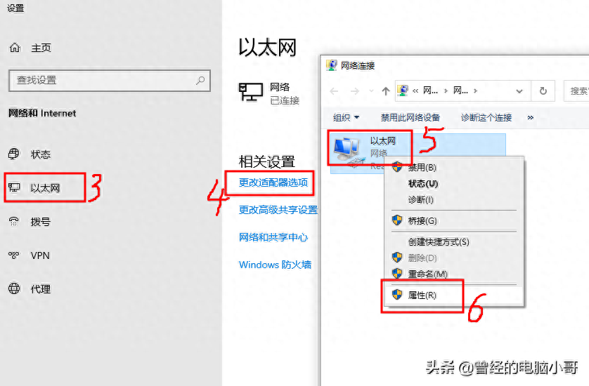 方法一:桌面上找到“网络”图标→右键鼠标点属性→更改适配器设置→以太网→右键鼠标点属性→