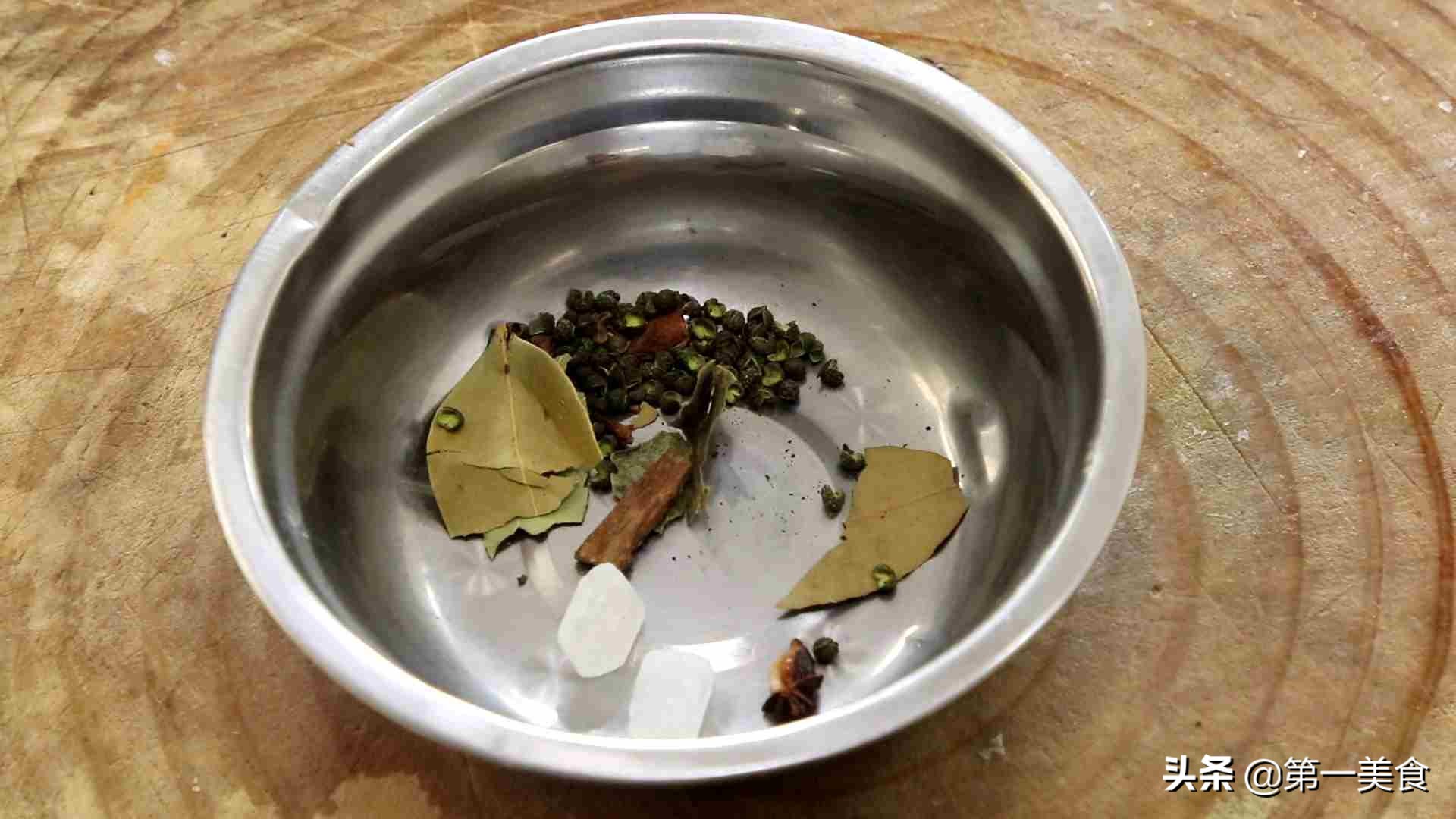 2.蒸鸡蛋的时间,我们准备一下辅料,盆中加入少许八角,几片香叶,青花椒5克,桂皮一小段,两块冰糖,再准备一小包茶叶,在清水泡发备用。