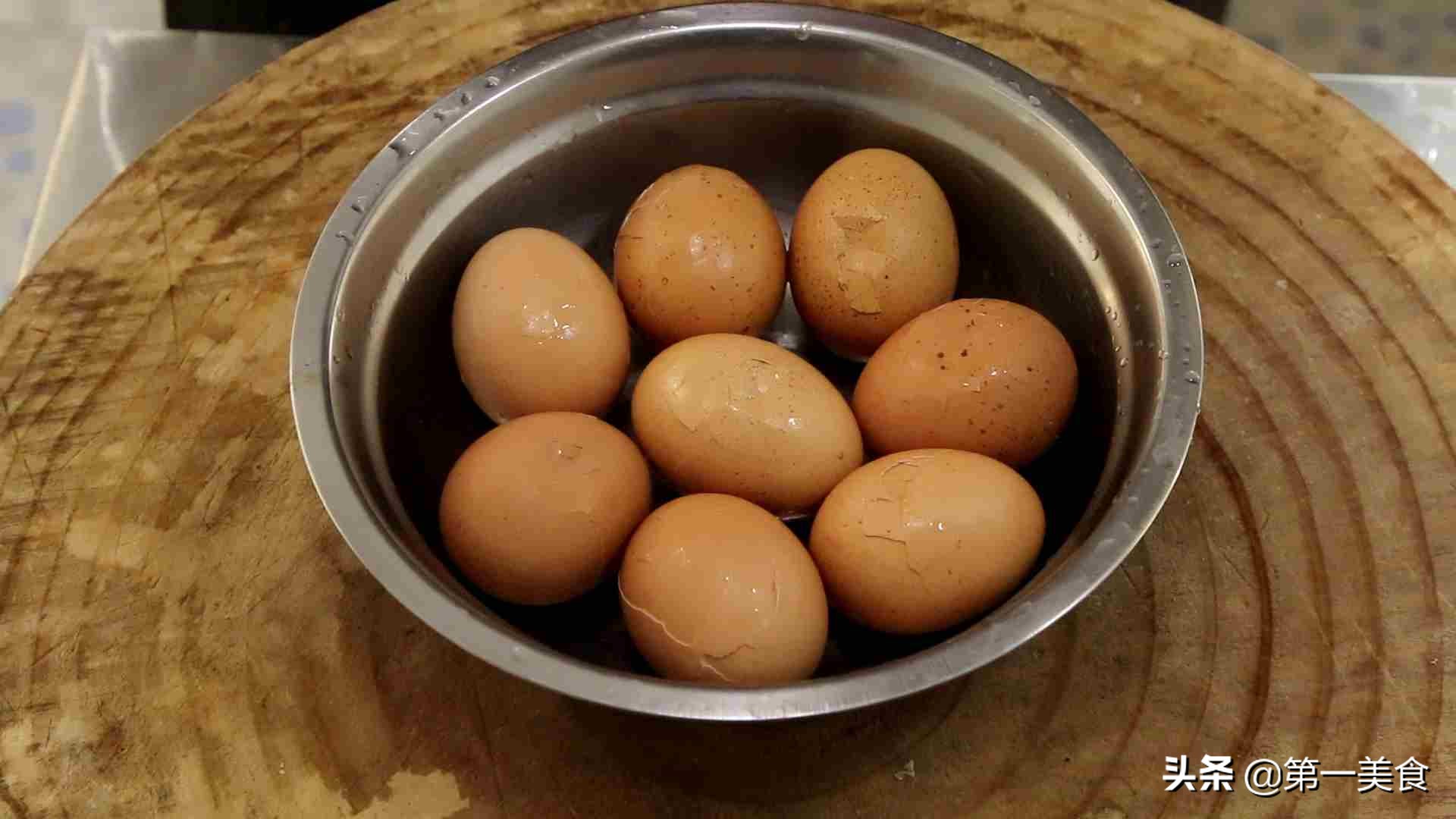 8分钟之后把蒸好的鸡蛋从锅中取出,放入清水中透凉,然后把透过凉的鸡蛋捞出敲碎外壳备用。