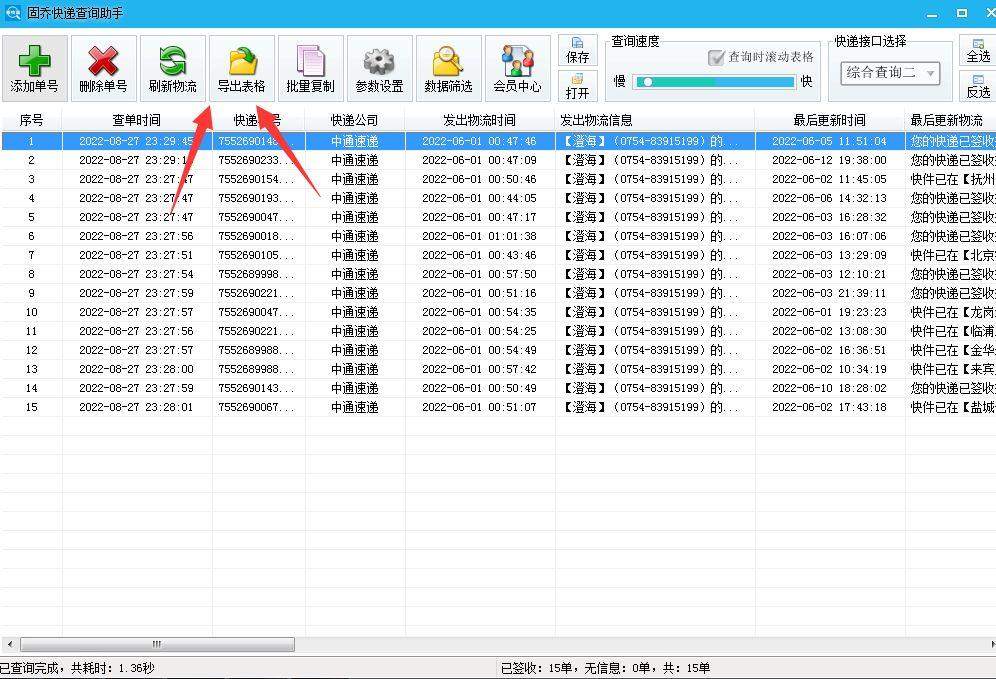 如果想把这些快递数据保存在本地电脑上的话,可以点击“导出表格”,大家可以看到,这些单号就以EXCEL的形式保存在本地电脑中了。