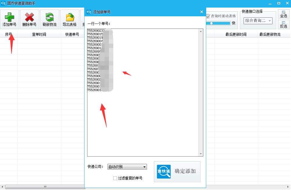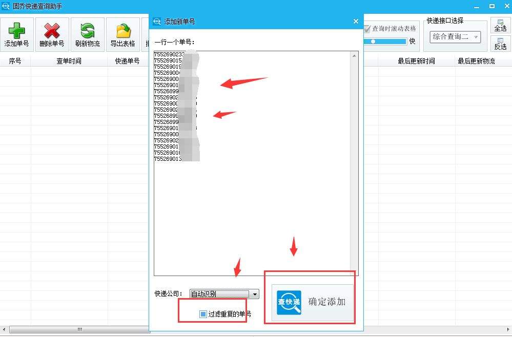 接着勾选“过滤重复单号”,这个功能可以避免单号重复查询,然后点击“确定添加”,软件就开始批量查询我们一键导入的大量快递单号了,所有单号的物流信息都能在软件中看到。