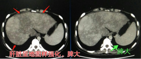 CT增强扫描,静脉期肝脏呈地图样、肝脾增大,少量腹水