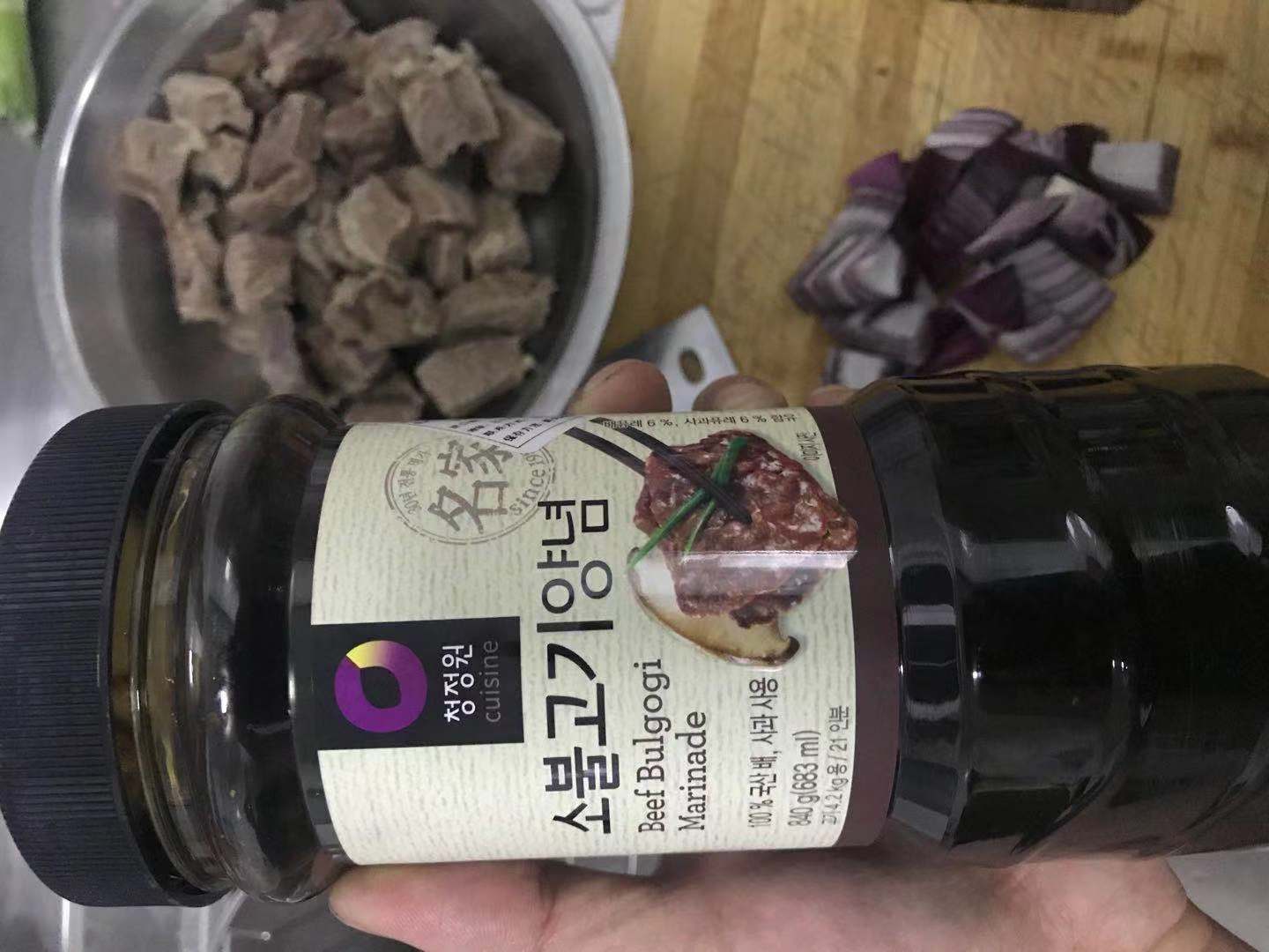 3. 调味腌制:圆葱切小块,大蒜几颗拍扁,加入料酒,两勺韩式牛肉酱(这个很便宜,可以到某宝买,不用怕用不完,保质期两年,做烤肉/炖排骨/红烧肉都可以)。用手抓匀,保鲜膜覆盖,放冰箱保鲜一晚上。(别着急哈,好饭不怕晚)