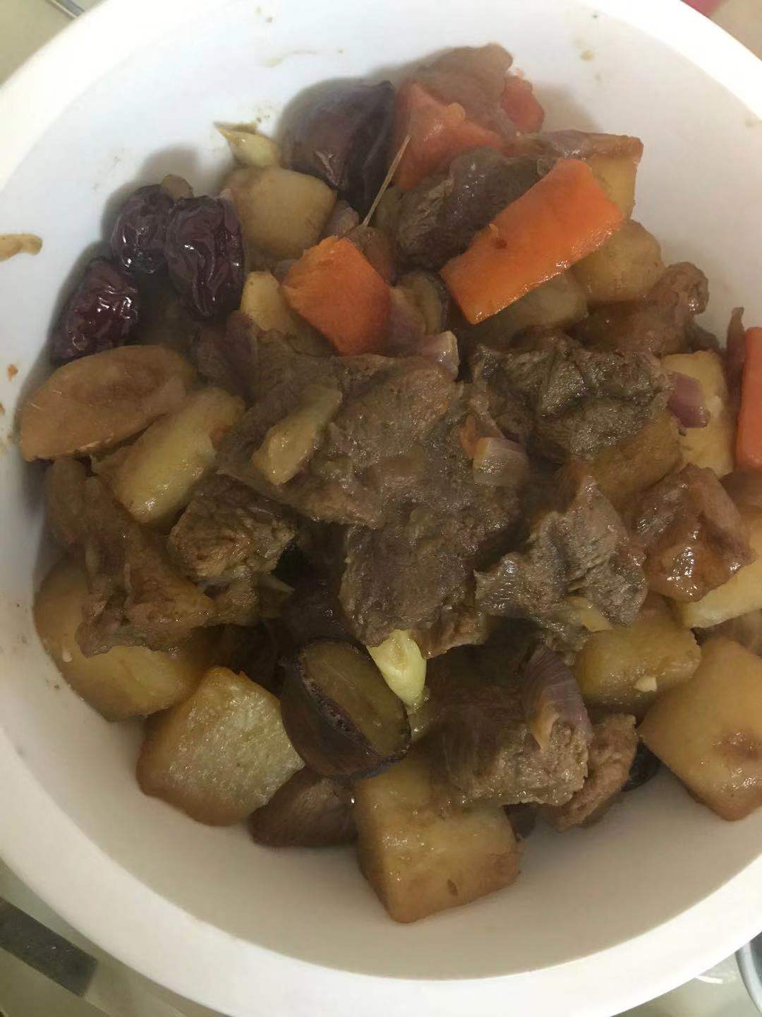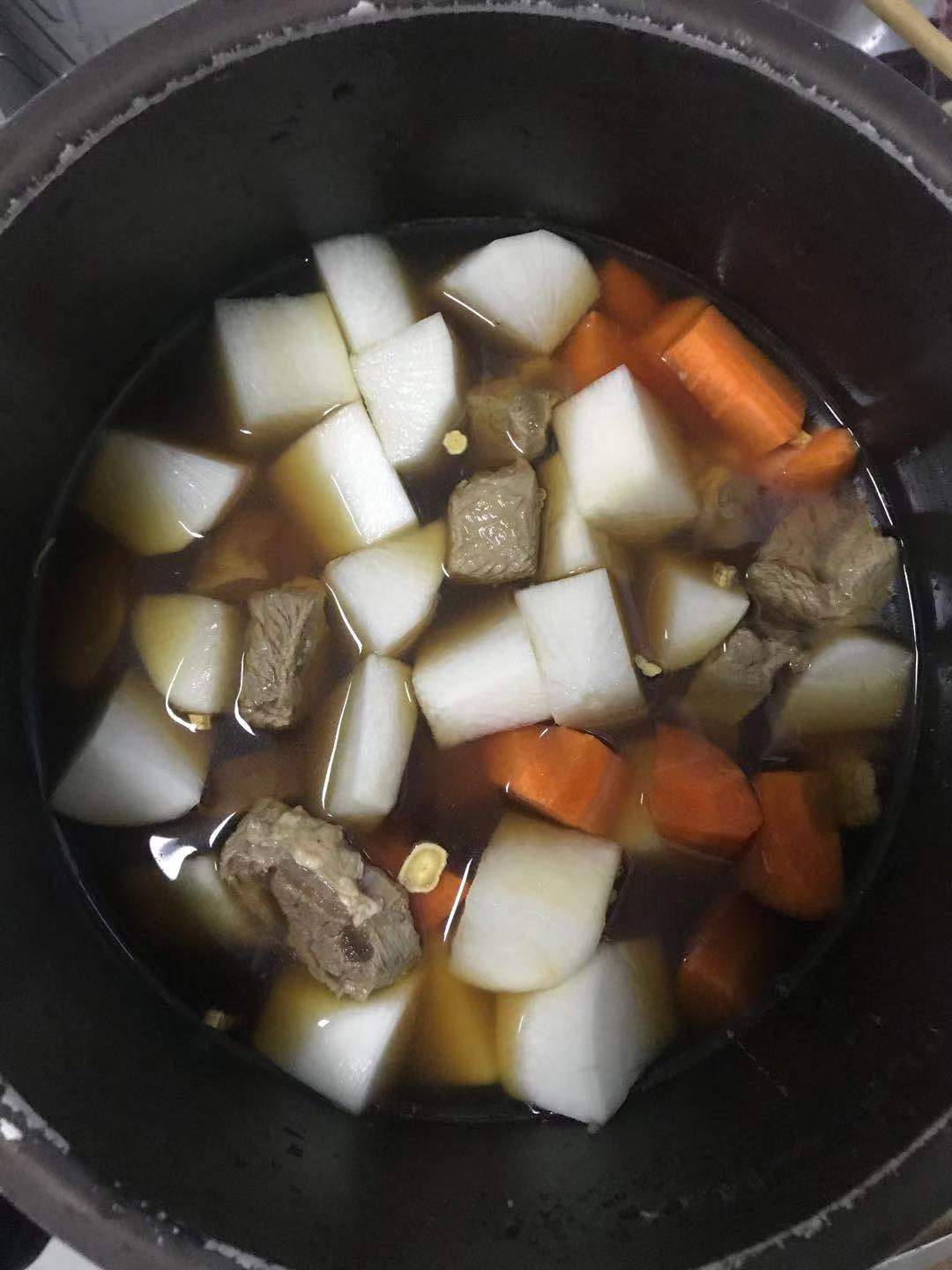 4. 腌制好的牛肉放进压力锅,加入老抽一点,味达美多一点,白萝卜/胡萝卜切块放入,另外根据自己喜好放入几片生姜和两片黄芪(这个正规药店有售,可买零的,两块钱足够做三次的),嫌麻烦也可以不放,倒入与肉齐平的水,开火15分钟左右。
