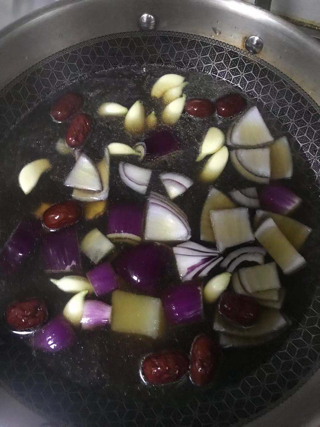 5.倒出压力锅内肉汤至砂锅,加入圆葱(真搞不懂韩国人怎么这么喜欢圆葱,不过味道确实够纯),整瓣的大蒜,红枣几颗,板栗几颗(为了吃牛肉,不放也罢),煮至圆葱变软,然后再倒入压力锅内的牛肉,大火煮沸,略收汤,即可出锅。