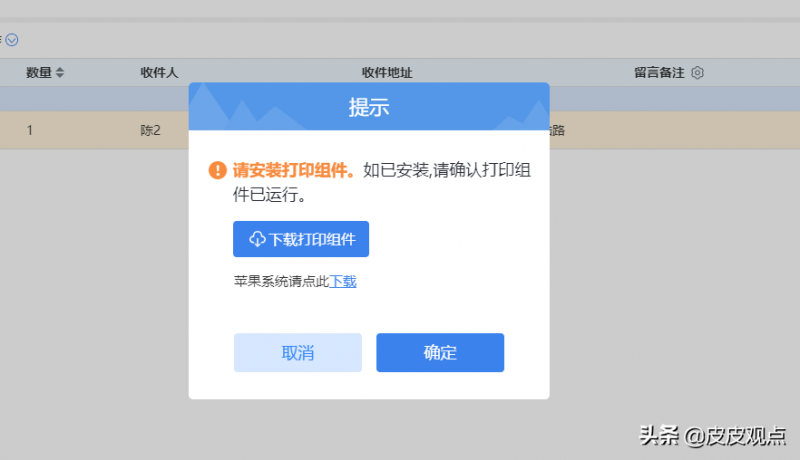 界面提示需安装一下菜鸟打印组件,点击下载,安装好后台运行,刷新打单界面,再次点击
