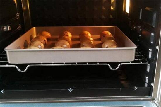 若是想做出来的面包口感更好,可以在托盘的下面放一盆水,这样能防止面包里的水分流失,之后盖上烤箱门后,让其进行二次发酵,待其膨胀后,在中间的缝隙里刷一层蛋液,将温度设置成180度就可以了。