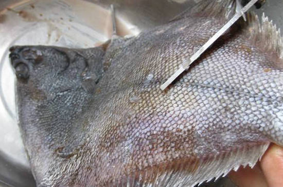 将偏口鱼清洗干净之后,用钢刷慢慢将偏口鱼表面的鱼鳞去除,注意去鱼鳞的时候力度不要太大,以免刮伤鱼肉,否则会影响鱼肉的口感和风味。