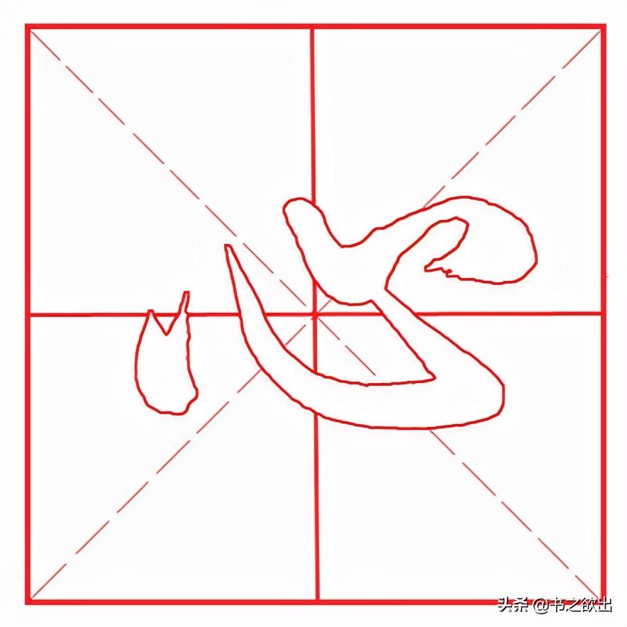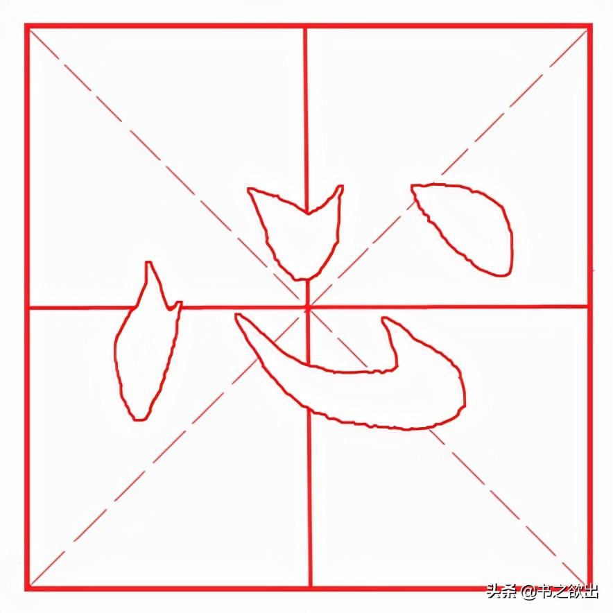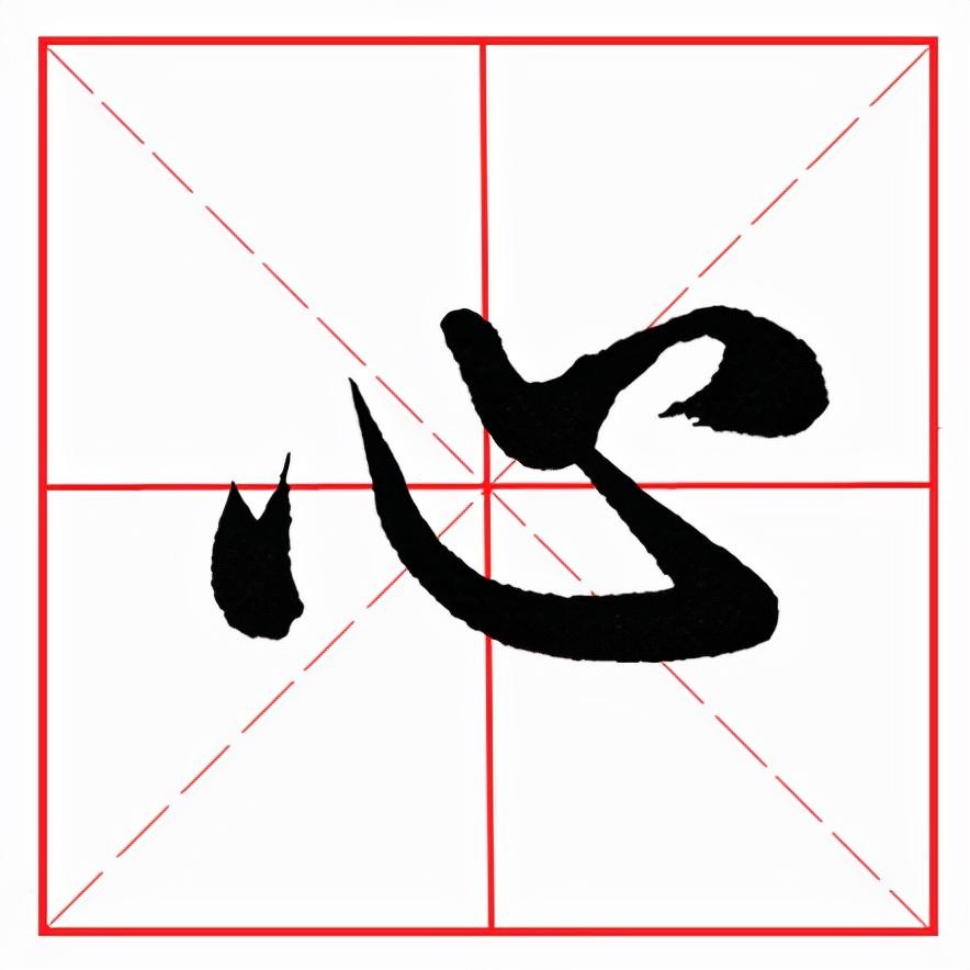 整体稍扁平,三个点笔分布均匀,笔意相连。首笔左点位置靠下,露锋轻入,然后左行重按,形态饱满,下行到位后向右上回锋收笔;卧钩不要写长,注意角度。起笔低于左点,同样露锋轻入,然后边行笔边慢慢加重,弯度不要大,先陡后平,行笔到位后再向左上方挑笔出锋,出锋勿长;第三笔仰点位置稍高,先以写右点的笔法入笔,然后向右上方挑出,出锋引带下一笔画;最后右点与仰点基本平齐,形态饱满,三角一肚。