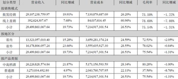 在保证核心产品与规模高质稳健增长的同时,洋河股份还积极进行经销体系改革,推动终端渠道升级。报告期内,公司经销商数量净增加96家,经销渠道实现营收291.07亿元,同比增加19.91%。按地区划分,公司省外市场实现营收161.79亿元,同比增加23.66%,省外市场占比持续提高。