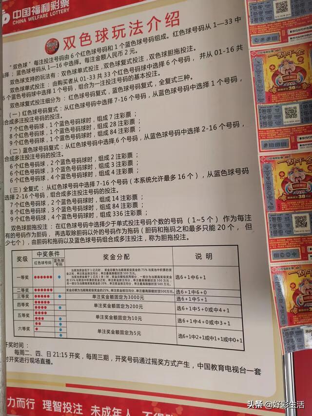 双色球是以33个红球和16个篮球号码组合而成,从中选取6个红球和1个篮球共7个号码,单注投注金额两元。