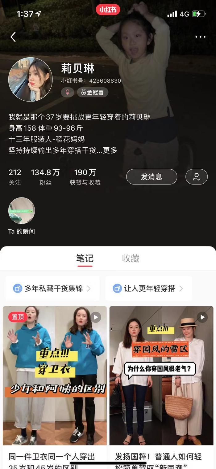 那时候莉贝琳感受到了涨粉的甜头,从那时候开始她对小红书视频开始有了不一样的感受,看到每天都有涨粉的那一刻她知道了自己该做的是什么了,那句,大家好,“我是37岁挑战更年轻穿着的莉贝琳”更是成为了她接下来几个月最常说的icon。