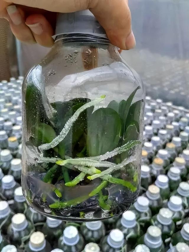 所谓组培苗,就是把蝴蝶兰的根茎细胞切下来,将细胞放在无菌环境中,在各种植物激素和营养液的刺激下加快细胞分裂,可以快速廉价地繁殖出大量蝴蝶兰小苗。
