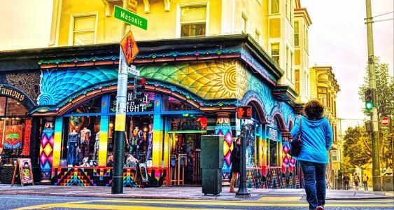 金门公园东门口的海特街,确切说是上海特街在60年代,曾是全世界渴望单纯美好的年轻人们的梦想之地,成群结队的嬉皮士们聚集在金门公园的草坪上。而现在的海特街有着各式各样的特色小店,非常有名的是海特街上那条著名的从二楼破窗而出的丝袜男人腿,当你走进去你会发现,这只是一家二手衣店。在海特街,你会看到很多老房子都被夸张个性的涂鸦以及各种招牌包裹,一整片街区都是透露出嬉皮士文化~