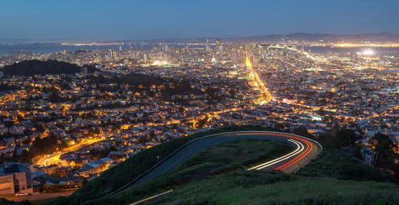 旧金山的双子峰,是两座并列的山丘,因为形状的原因被早期的西班牙移民昵称为“印第安少女的乳房”。如果从市区开车的话,很快就能到双子峰,站在双子峰的观景台上,可以360度全景观看旧金山这座城市的美景。所以特别推荐大家在日落黄昏和晚上去,黄昏美景和夜景更是别具一番味道~