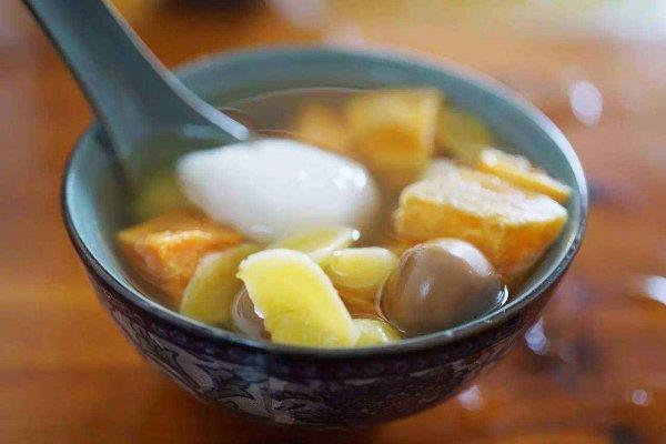 鸭母捻,这是一道糖水,类似于汤圆糖水,鸭母捻有多种馅(绿豆、红豆、芋泥等),为便于区分,不同馅的鸭母捻都有自己的记号,如有的形状圆、有的椭圆,有的有红点。还可以把“鸭母捻”捞干,洒上花生芝麻碎,这样就成了另一种美食“凤凰春”。潮州传统的鸭母捻是要求每碗三颗汤圆,每颗的馅都不一样,皮柔韧,馅软糯~再搭配鹌鹑蛋、银耳、莲子、百合、白果、绿豆等配料,应有尽有~不甜不腻真的好吃!