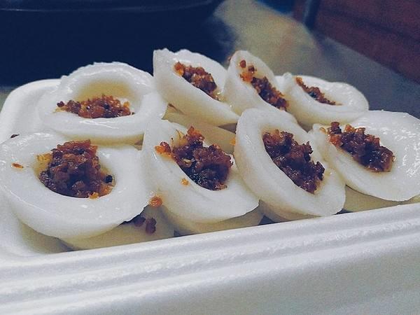 咸水粿相传在潮州流传至今已有几百年的历史。它形状小巧玲珑,像只厚厚的小碟,很洁净的白色,中间有个凹下去的地方,可以盛着加了辣椒酱、蒜蓉一起爆香过的潮州特产菜脯粒。冷冷的粿加上热热的菜脯,交织出特别的口感,粿滑润柔软,菜脯味芬芳咸香。卖主大都是推着小车在街上卖,一块钱就有十多个,是潮州小吃中比较廉价,却有很强生命力的小吃。