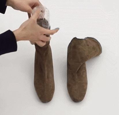 ● 换下的靴子应放置于通风处阴干,防止鞋内滋生细菌;靴内可放入,用快递防震膜卷起来的长筒,防止变形,最后套上防尘袋。