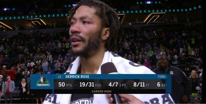 罗斯50分!真的太励志,太让人感动了!人生就是要不停地战斗啊!曾经的“芝加哥玫瑰”,公牛队的领军人物,NBA史上最年轻的MVP,三次NBA全明星阵容。因为伤病,先后辗转纽约尼克斯队、克利夫兰骑士队以及犹他爵士队,被爵士队裁掉之后,以底薪加盟明尼苏达森林狼,打替补,却场场都打得很拼!前天打湖人,本来是想看看詹姆斯在湖人的表现,结果却被罗斯吸引注意力。他还是很快,切入到篮下的速度依然惊人。尽管伤病缠身,尽管拿着底薪,尽管替补出场,球场上的罗斯却依旧打得很努力,脸上写满了坚毅与热血。而今天,森林狼主场力克爵士,德里克·罗斯砍下生涯最高的50分!这是罗斯本赛季第一次以首发的身份出战,迎战当初裁掉他的爵士,最终爆砍生涯新高的50分!赢下比赛之后,队友唐斯把比赛用球交给罗斯以作纪念,而此时的罗斯却已经热泪盈眶,当着镜头泪洒赛场!没有人知道他经历了多少难熬的时刻,没有人知道他付出了多少努力,但在这一刻,他的50分证明了一切,他的眼泪令人动容,他的那股拼劲更是鼓舞人心已经三十岁了,罗斯还在球场上拼搏着,祝福他!