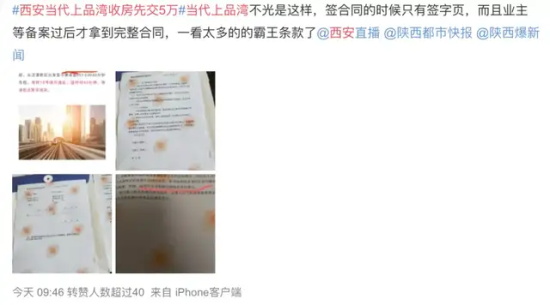 西安当代上品湾收房先交5万,多名业主私信称,西安当代上品湾小区交房当天业主被告知需要支付5万元(包含契税+大修基金+房屋面积差价),且验房只能带2名家属,不允许验房师进入。